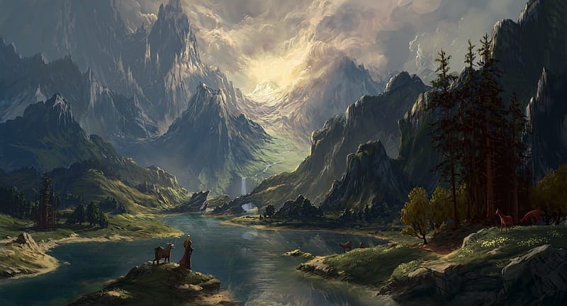 So Jack flew up into the moonlight and began following the Lion. They ended up on the top of a mountain so high it seemed to be in the clouds. All he saw there was the Lion and a magical well. The well was large, round like a small pool, with stone walls that rose a few feet—but it seemed as deep as the mountain itself.